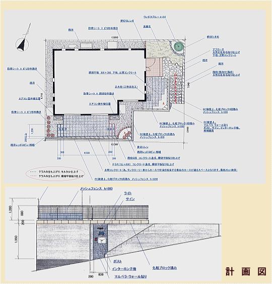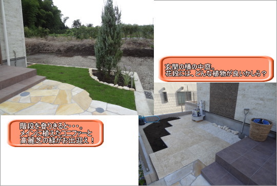 玄関前を、左に回りこむと、南側の大きなテラスに 行きますが、中庭にも、