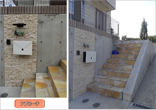 アプローチ階段と、ポスト、表札、インターホン、照明の部分です。