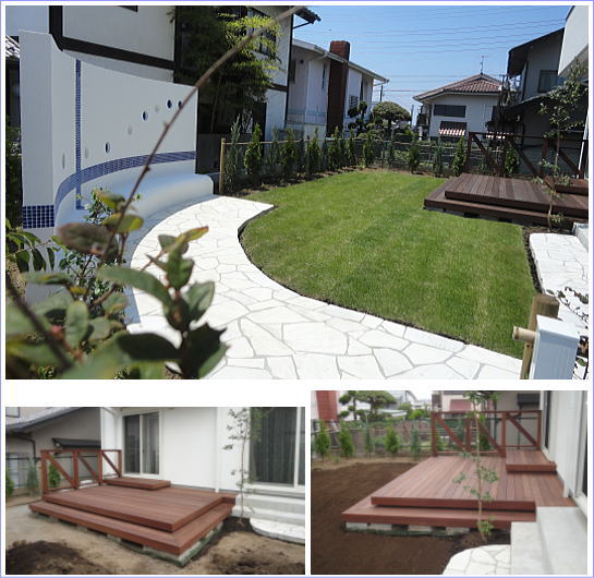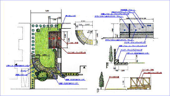 駐車場からお庭に入る通用口とウッドデッキ、ベンチに繋がる通路を確保してデザインしたプランです。