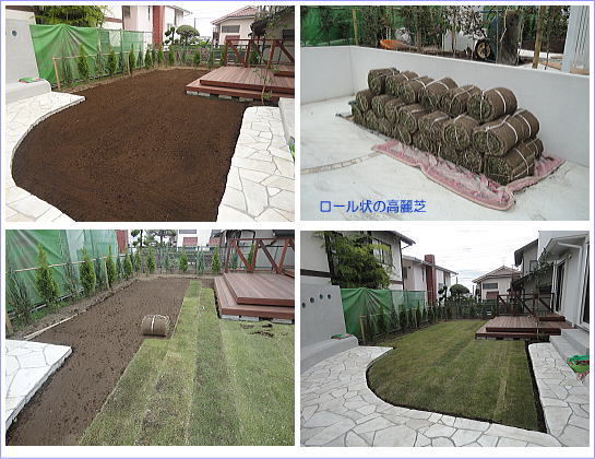 芝貼りの様子です。芝生に必要なのは日当たりと水はけの良い環境です。 綺麗に芝生を張るには、先ず雑草取りからですね。綺麗の根っこまで取り除いた後、平らに整地します。更に芝生の用土を被せて平らに均します。いよいよ芝生を並べます。 並べ終わったら充分な散水です。芝生は殆ど隙間なく並べますので、目土の必要はありません。 一週間から10日程は、毎日散水を続けてください。 その間は、なるべく芝生に入らないようにしましょう。
