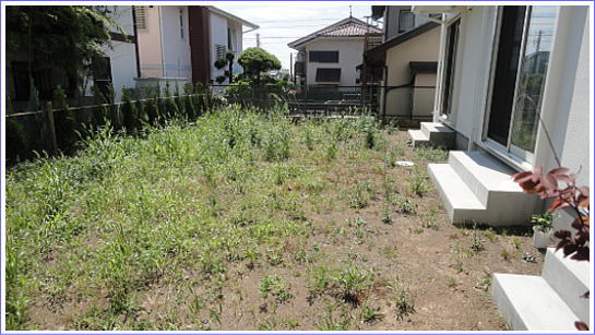 いわゆる外構工事は素敵に出来上がっていました。 が、お庭は草ボウボウでした。砂地のお庭は、大変な思いをして草を抜くと風で砂が舞います。草ボウボウにしておくわけには置けないし、抜いても抜いても直ぐに伸びてくるし・・・・。草も困るし、砂の舞う風も困るし、・・・・・。どうしましょう?