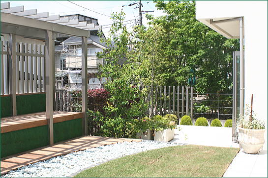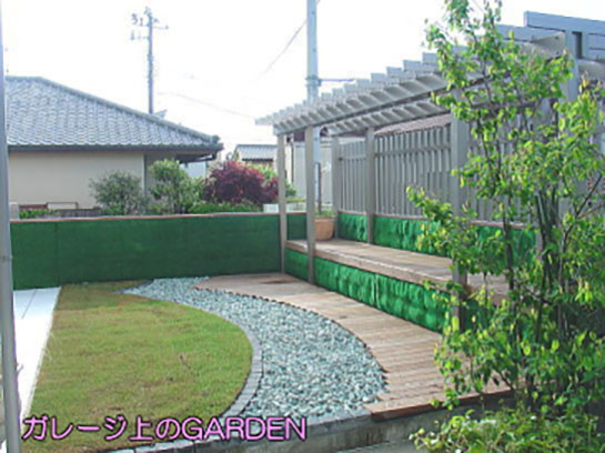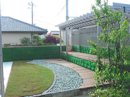 ■RC造の腰壁には、砂ゴケマットを。 ■グリーンコンテナに天然芝。 ■化粧砂利。 ■イペ材のスノコ。 ■アルミ材のパーゴラ。
