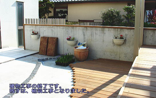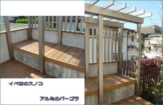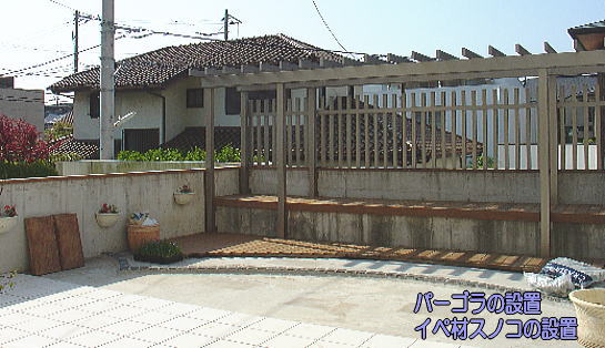 アルミのパーゴラ・イペ材のスノコを設置。