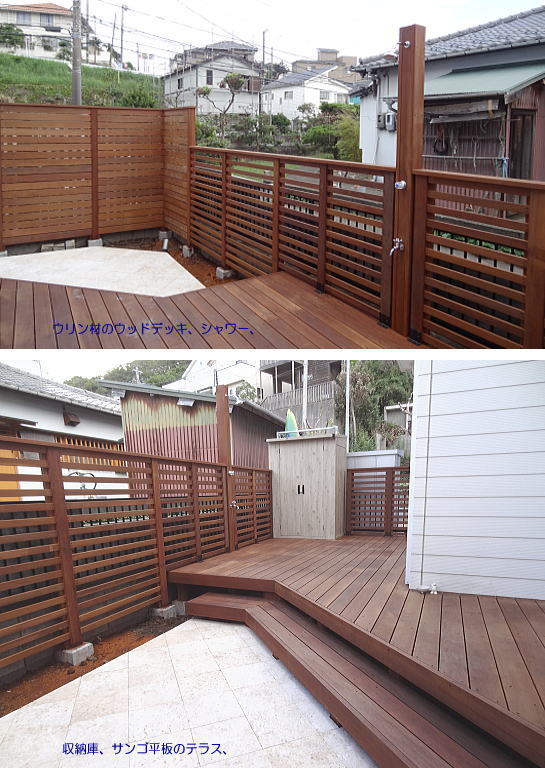 ウリン材のウッドデッキ と オリジナルのシャワー
