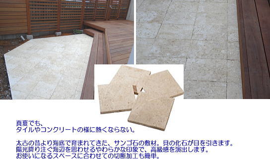 サンゴ石の平板敷きをご提案させていただきました。見た目も、とても優しい色調と感触が魅力ですが、それ以上に、サンゴ石の特徴で、真夏でもタイルやコンクリートの様に熱くならないのです。照り返しも穏やかです。 南面のテラスやパティオの素材としては、これ以上の素材は思いつきません。
