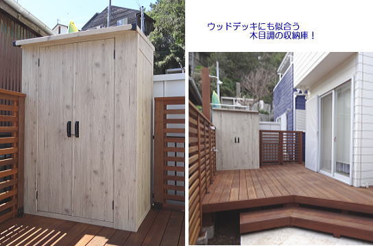 ウッドデッキにも似合う木目調の収納庫を選びました。
