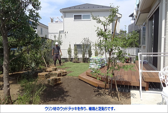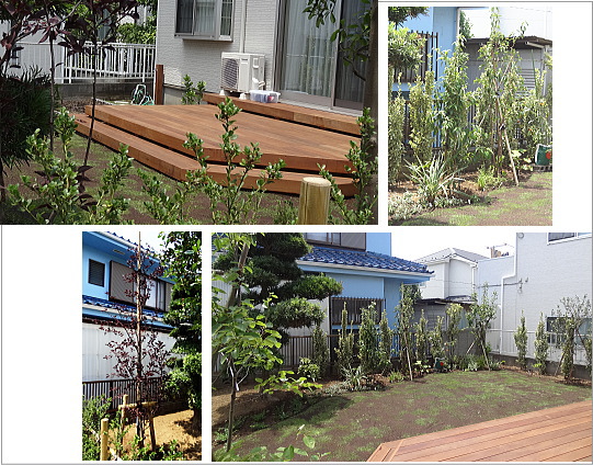ウッドデッキと、芝生と、菜園と、お花と、植木と、目隠しの生垣と、・・・・・・・。