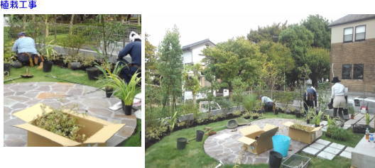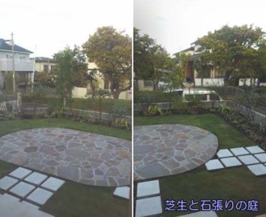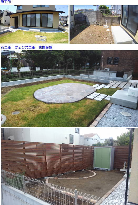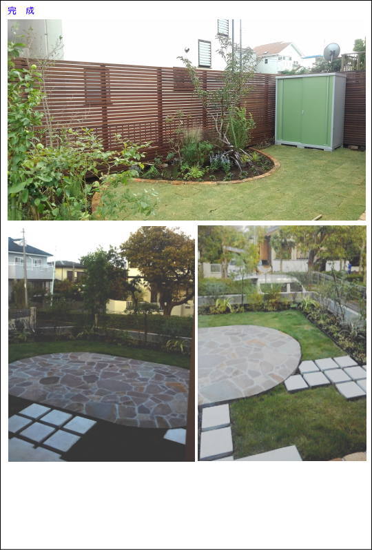 東側の庭は手付かず! 北側の庭は芝生だけ植えてありました。東側の庭には、物置と目隠しのフェンス、植栽をして、キッチンの窓からの景色を楽しみながら、ご自慢のお料理をお楽しみください。芝生だけだった南庭には、バーベキュウ等も楽しめるように石貼りのテラスを作り、丸見えだったフェンスの内側に大小の植木を植えて、外からの視線も考慮しました。植栽は、中木8本、低木40本、下草類120ポットと、沢山の種類を植え込みました。これからの植栽の成長が楽しみです。