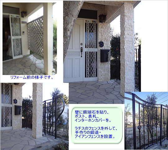 ポスト、表札、インターホンカバー、照明、アイアンクラフトの手すり、