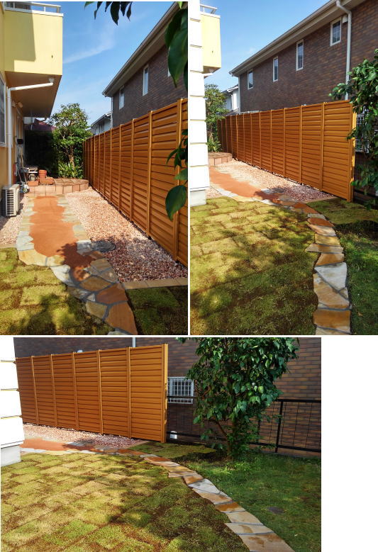 ガーデン&リフォーム 庭のリフォーム 大きくなりすぎた植木の手入れや植え替え。コニファーの目隠しの生け垣を樹脂フェンスに取替え。芝生の中の飛び石を石張りとシラストントン舗装の組合わせで、歩き易くてデザイン性のある園路に改修。傷んだ芝生を張り替えました。 ガーデン&リフォーム 長いアプローチの家 茅ヶ崎に新築しました。
