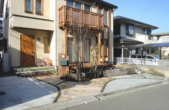 ウッドデッキとアズキナシという樹がメインになり、R型の植栽目地が効いています。