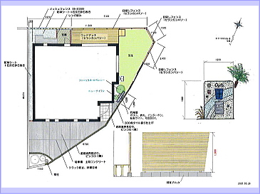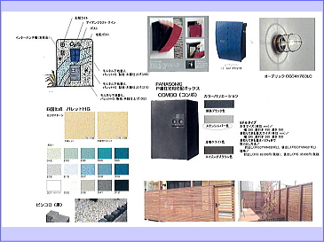 3色に色分けされた門袖壁にポスト、サイン、インターホン、船舶ライト、宅配BOXを組み込み、貝殻などを埋め込み、個性的な門袖壁が出来ました。