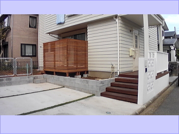 玄関アプローチは、アメリカン調のウッド階段と手すり。