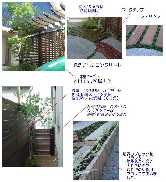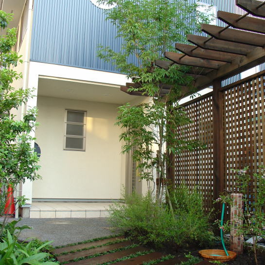 両隣の環境面もあり、高さ2m程の板塀や高さ2.4mのラチスフェンス付きのパーゴラも、このアプローチの雰囲気を確保するには必要な要素でした。