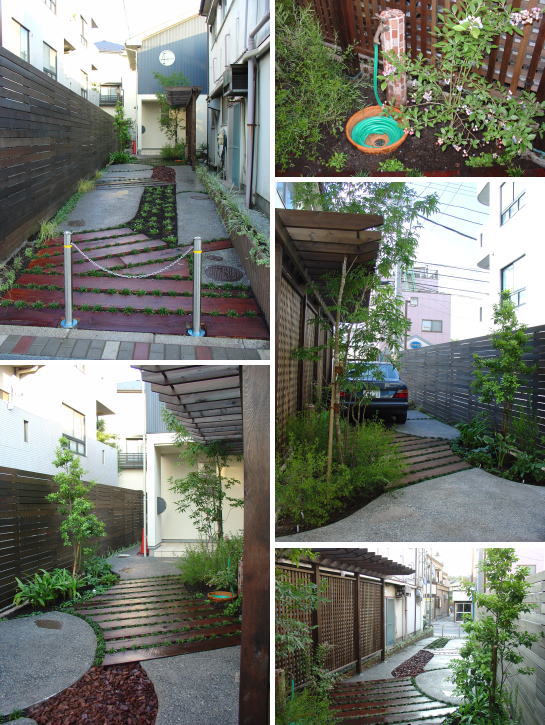 細く長い通路の両側に背の高い塀を作るのは、更に狭く感じさせるので、敬遠されがちですが、植栽やデザインを工夫をすることで、かえって良い結果になる事の方が多いものです。