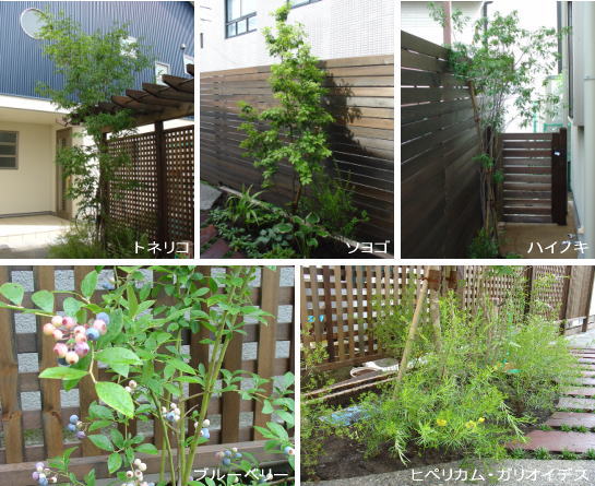 トネリコ ソヨゴ ハイノキ ブルーベリー ヒペリカム・ガリオイデス 銀梅香(ミルテ) クリスマスローズ ホタルブクロ ヤブラン・ミスキャンタス ビンカミノール アジュガ(白花) ブルーシラン ヤマホロシ 口紅シラン セルフヒール 姫イワダレ草 カシワバアジサイ アスマンサス・パークウッディ 黄金セキショウ タツナミ草 ティアレアブラックベルベット ベロニカ・マダムマルシア カレックス・ジェネキー タマリュウ ギボウシ・フレッシングガムブルー ギボウシ・サガエ ほか