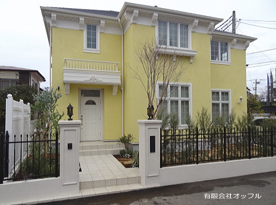 ヨーロピン調の飾りが付いた東急ホームの建物の外構・造園プランです。