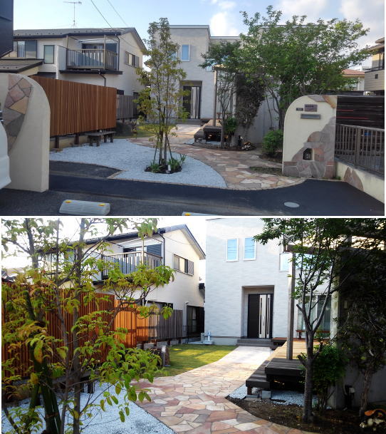 新築外構 長いアプローチの家 茅ヶ崎の以前両親の住んでいた家を解体して、建て直おすことになりました。家は少し小さくしましたので、アプローチが更に長くなりました。お庭は、使える部分を有効に残しながら、デザインし直してのロフォームです。 新築外構 アパートの目隠し 庭のリフォーム
