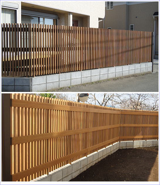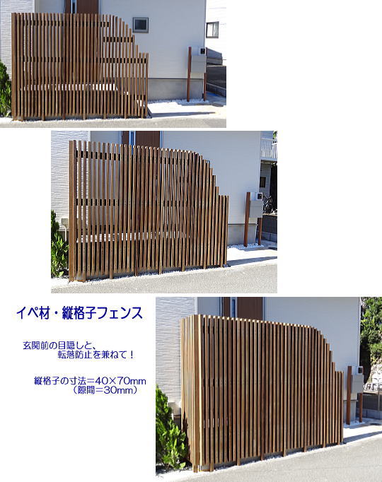 柱も縦桟も同じ形状のウリン材。だから、ブロックの上に施工が出来る。