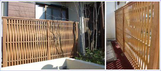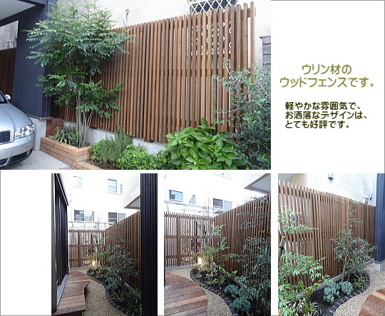 お隣りとの境界のフェンスを プライバシーを保護しつつ、木製(ウリン材)の縦桟フェンスを設けました。