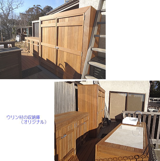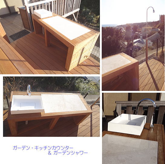 木製物置 キッチンカウンターと収納庫 ウリン材のキッチンカウンター ウッドデッキに、外用のキッタンカウンターがあったら便利ですね。 キッチンカウンターと収納庫 木製物置 パーゴラ・テラス屋根 ウッドデッキ